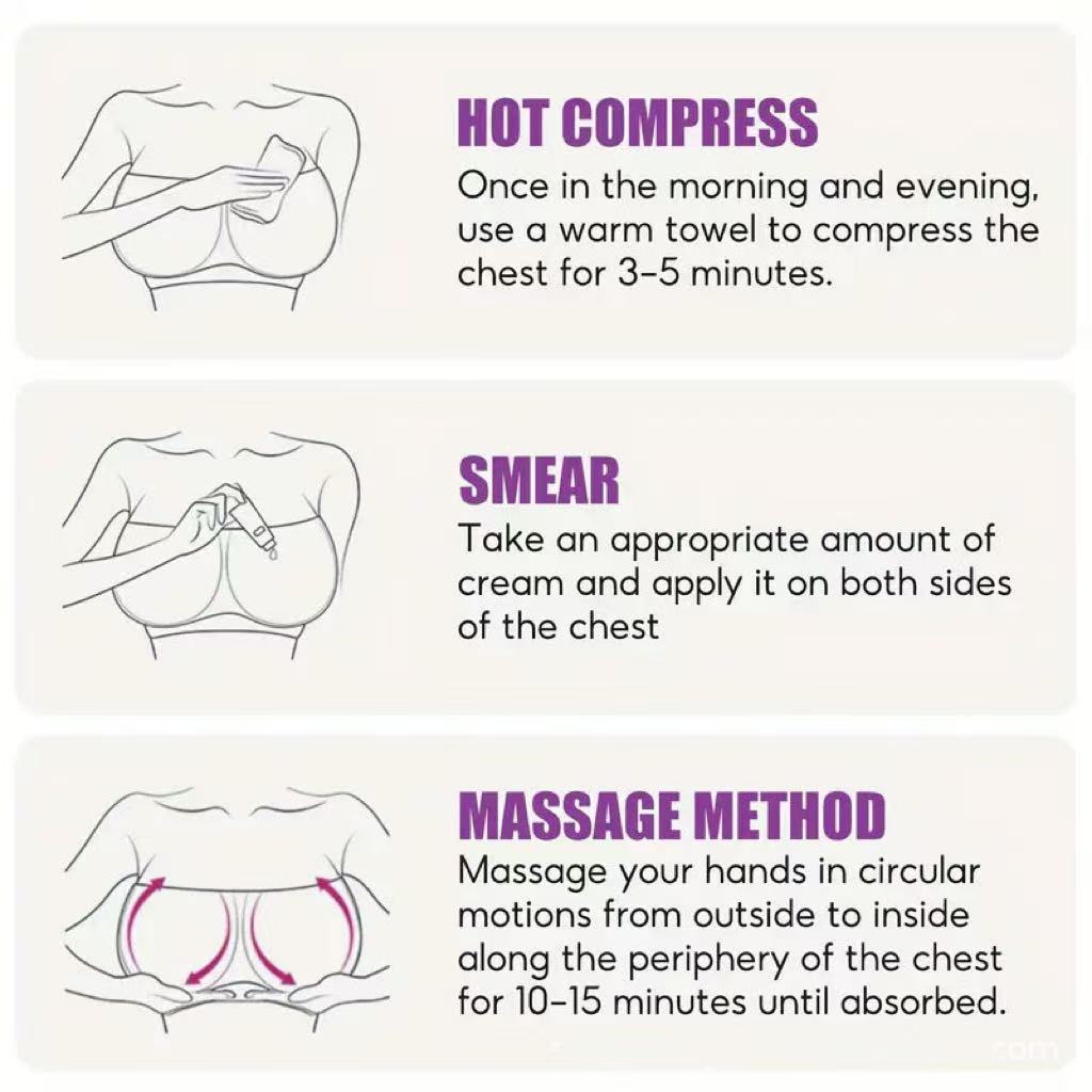 - Open pores with heat: Apply a warm towel to the breasts for 3–5 minutes morning and night to open skin pores and boost absorption.